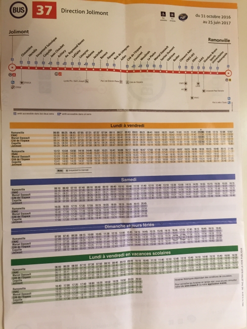 メトロのA線Jolimont駅もしくはメトロB線Ramonville駅から、バス37番線に乗り停留所「シテドレスパス」で降ります。Jolimont駅もRamonville駅もどちらも37番線の始発ですので、方向で迷いません。