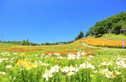 標高1,250mの場所に広がる、色彩の高原リゾート「花の里」。とくに夏は避暑スポットとして人気です。ロマンスエリア、白樺エリア、展望ロックガーデンに、5月上旬〜10月下旬にかけて季節ごとの花が咲きカラフルな花畑を楽しむことができます。標高1,400mの創造の森へは、天空カートを利用するもよし、花を眺めながら展望リフトに乗って行くもよし!創造の森からは、富士山、北岳、奥穂高岳の日本3大高峰を望む絶景を眺めることができます。
