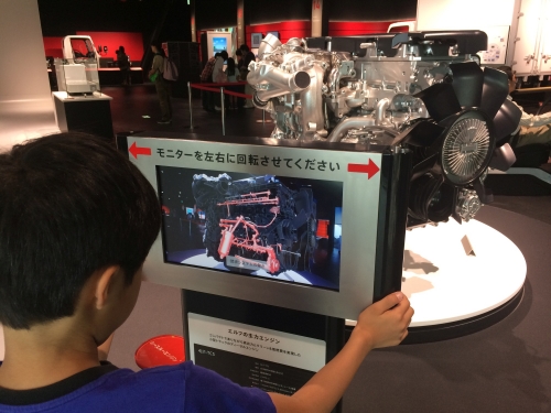トラックのしくみを学べる展示もあります。トラックの構造をムービーで解説するスクリーンや、大型車両で使われるエンジンの動きを解説するモニターなど、実物と動画を組み合わせた解説はとてもわかりやすいです。