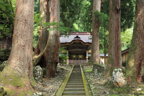 古くから信仰の対象であった霊峰白山(標高2,702m)の越前側の拠点として、717年(養老元年)に僧泰澄(たいちょう)によって開かれました。現在は「国史跡白山平泉寺旧境内」として指定されていて、現在の参道脇には、500年ほど前に作られた石畳道の旧参道も約1kmほどにわたり残されています。