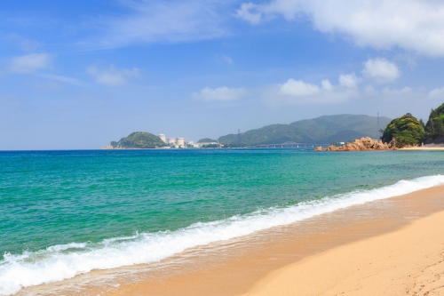 若狭湾に面した美浜町にあり、「日本の水浴場88選」にも選ばれている海水浴場。透明度の高いエメラルドグリーンの海と白い砂浜とのコントラストが美しく、日本有数の絶景ビーチとしても知られています。海水浴はもちろん、夕日を眺めるのにも絶好のスポットなので、夏のシーズンに限らず立ち寄ってみては?