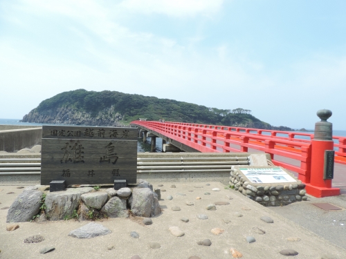 三国町の沖にある周囲約2kmの島で、地元では神の島とも呼ばれる神聖な場所でもあります。対岸から島に架かる美しい朱色の橋がシンボルで、徒歩で島に渡ることができます。