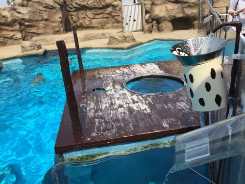 イルカのショープールと客席の間中央に、イルカたちが最も客席に近づくステージがあります。そのステージは通常、入口のゲートが閉じられているのですが、イルカショーの直後はゲートが開いており、ゲートが閉じられるまで数十分あります。その際に、ステージに近づいてみましょう。