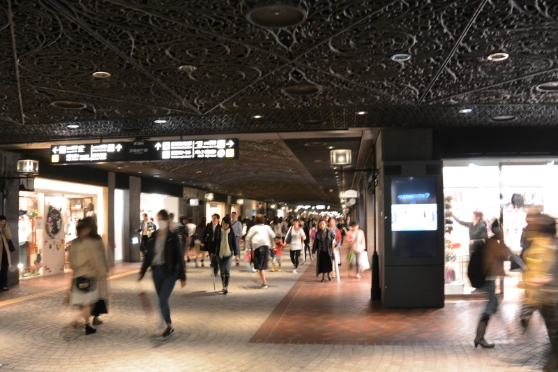 この天神地下街は19世紀のヨーロッパをイメージして造られており、アーチ型をした天井など、各ポイントのデザインがとてもお洒落。少し薄暗い感じも、不思議な居心地の良さを演出しています。