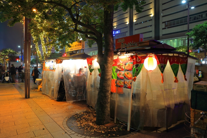 中洲と同様に、天神エリアにも屋台街があり、こちらには福岡市内の屋台の約半数が集まっています。特に、大丸福岡天神店前や渡辺通り沿い、昭和通り沿いのほか、西鉄福岡(天神駅)周辺に多くの屋台が立ち並んでいます。