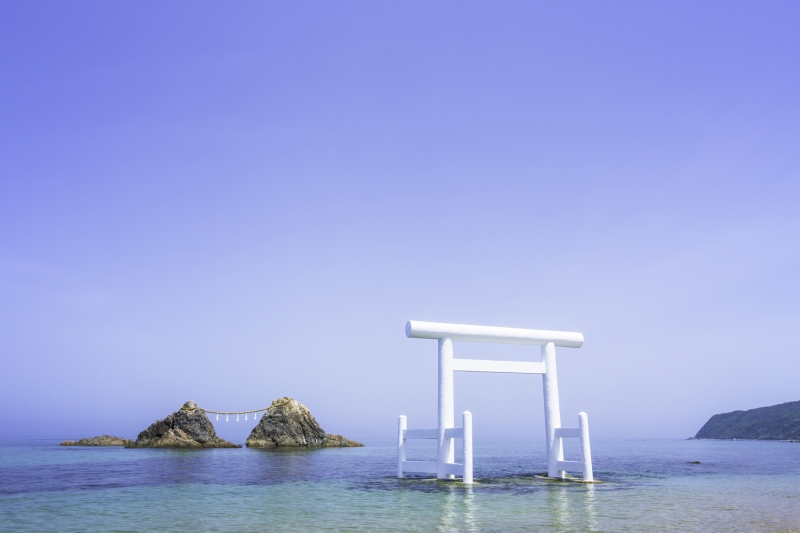 ここでは、真っ白な鳥居の真下で夫婦岩を背景に写真を撮るのが定番。また西に位置している海岸のため、夕刻時にはサンセットも楽しめます。特に夏至の頃には、夫婦岩のちょうど間に沈んでいく夕陽を見ることも!