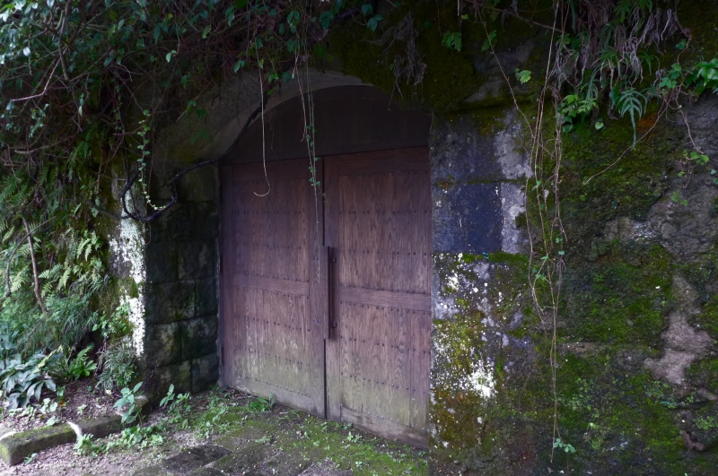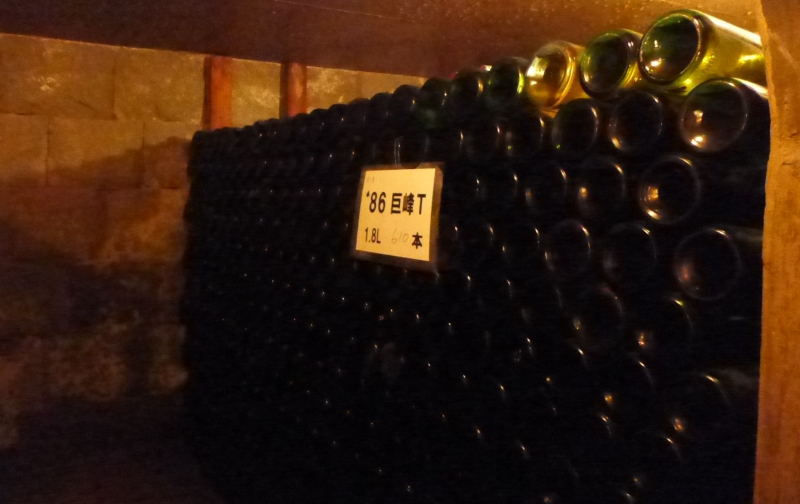 巨峰ワイナリーでは貯蔵庫の見学もできます。自然石を積み上げてつくった薄暗い貯蔵庫の中には、古いワインがいっぱい。巨峰ワイナリーは1972年から、巨峰を100%使ったワインをつくり続けています。