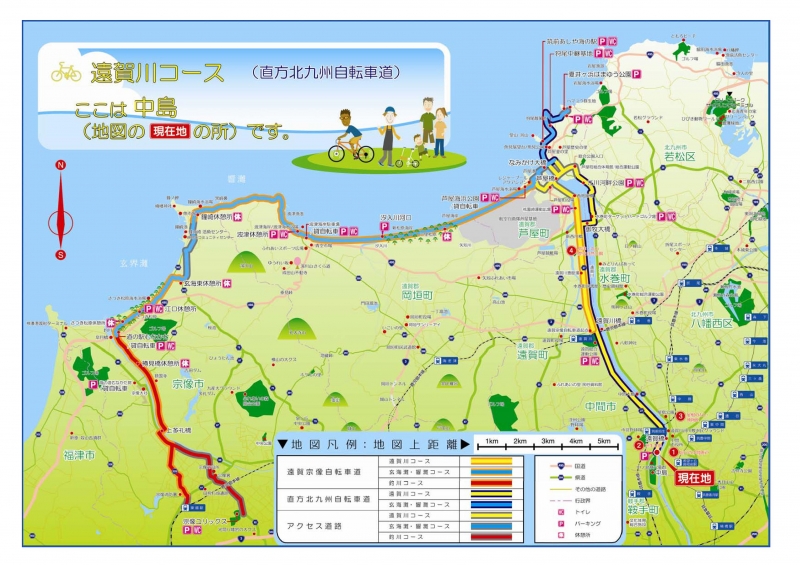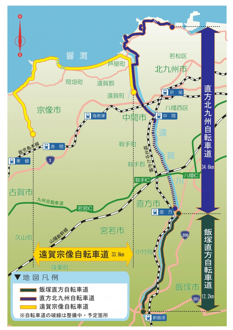 出典:www.pref.fukuoka.lg.jp直方北九州自転車道及び遠賀宗像自転車道案内図(※画像は福岡県のホームページより引用)