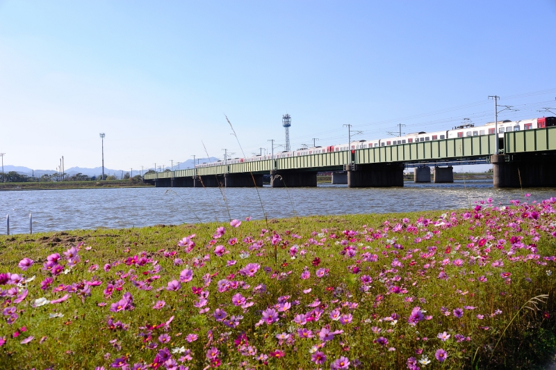 遠賀川橋下の河川敷をスタート。一級河川・遠賀川の河川敷を、河口へと下っていきます。平坦で、気持ちよく走れる道です。春には菜の花、秋にはコスモスが楽しめます。