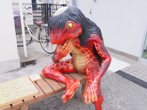 福崎町の妖怪で有名なのが、妖怪ベンチです。一緒に座って写真を撮ることができる形になっているのが人気!とぼけた格好をしているのですが、非常にリアルな造形なので、その姿に泣き出す子供たちもいるそうです。JR福崎駅前にいるのは河童の「ガジロウ」。かなり熱心に考えこんでいます。将棋盤を挟んで対戦相手になって記念写真を。この他にも福崎町には、雪女や猫娘など、10体以上の妖怪が町のあちこちに点在しています。
