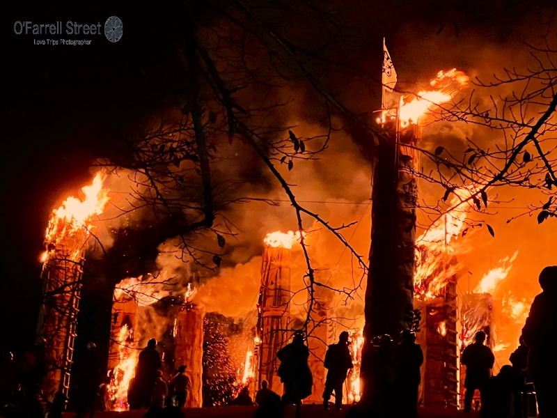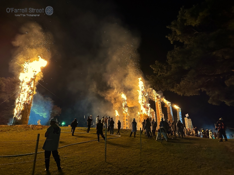 2024年の松明は総数21本、無数の巨大松明が、次々と炎に包まれてゆく迫力は、実際に見た者しか味わえない感動です。じわじわと燃える松明は、夜空を赤々と染め、遠くから見ればおそらく山が燃えているように見えることでしょう。