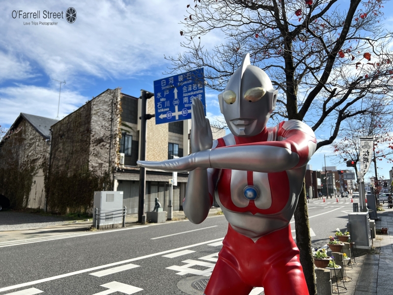 駅から市役所方面へ向かう松明通りには、ウルトラヒーローや怪獣のモニュメントがお出迎えしてくれるので、楽しい町歩きになるはずです。また通りの街路灯にはヒーローや怪獣のシルエットが描かれています。