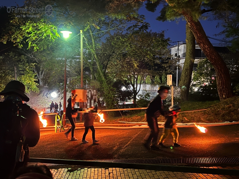 松明に点火されると歩き出しますし、炎や人並みの熱気もあるので寒さは感じなくなりますが、点火されるまでの数時間の待ち時間は寒さが堪えました。また風の強弱によっては、火の粉が飛んでくることも考えられるので、防炎対策の服装ができれば万全ですね。靴は、山と言っても公園内の整備されている丘なので、履きなれた靴で問題ないと思います。ただ、坂道や階段があり、松明の消火用に消火ホースも運び込まれているため、夜道で濡れている場所もあります。また大変な混雑で、足を踏まれることも多々ありますので、それらを考慮した履物がおすすめです。