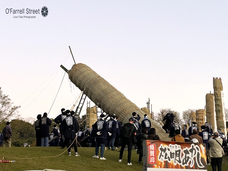 一番初めは、先ほどまで立ち上げを見守っていた大松明に地元有志が梯子も使わず、手と足を使って自力で登り点火します。固唾を呑んで見守っていた観客から、大きな歓声と拍手が送られます。