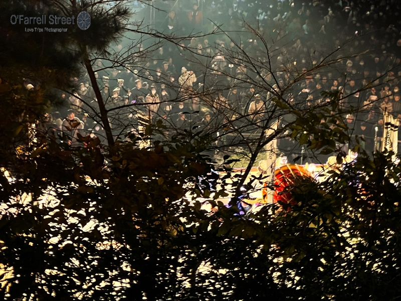 この松明あかしは、地域の結束や伝統文化の継承の雰囲気も濃いようで、地元の企業や中学校、町内会をあげて参加されています。この時間帯になると、観客も増え五老山への入山もすでに規制されていました。