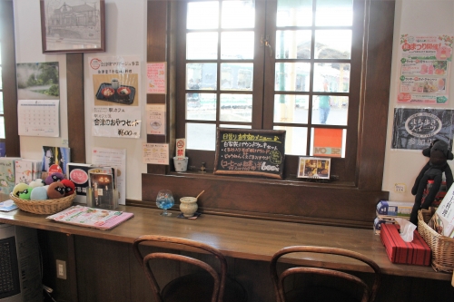 たくさんのお土産が購入できるアンテナショップ「駅Cafe.」は、カフェスペースもとても充実しています。おすすめはホームに面したカウンター席で、お茶をしながら、窓越しに電車の発着を垣間見ることができます。IR只見線のダイヤは1時間に数本しかないため、ホームと電車の写真を撮りたい場合は時刻表をあらかじめ確かめておきましょう。