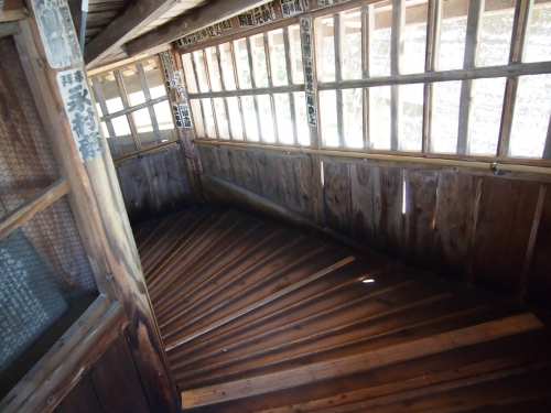 上り始めて数分でてっぺんに辿り着きます。上を見上げるとお札がたくさん張られており、独特の雰囲気が漂います。当時はこの千社札が参拝の証であったようです。