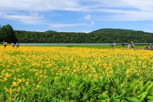 ここからは、ほぼ平坦な道がほとんど!景色を堪能しながらノンビリ行きましょう。大江湿原に入ると、5月、6月は水芭蕉が、7月に入ると、ニッコウキスゲが楽しめます。
