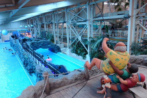 流れるアクアリウムプールには、熱帯魚やサメなど35種約1,300 匹の魚が泳ぐ水槽が設置されているので、まるで南国の魚たちと一緒に泳いでいるような気分。