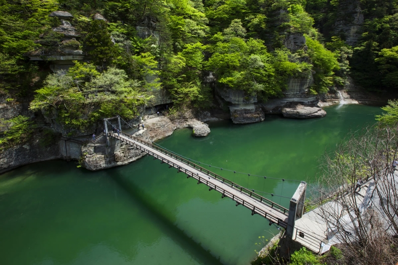 約200mにわたって奇岩・奇勝の続く景勝地で、“へつり”とは、この地方の方言で険しい断崖のこと。まるで塔のように削られた現在の奇岩ができあがるまで、100万年もの歳月がかかったのだそう。