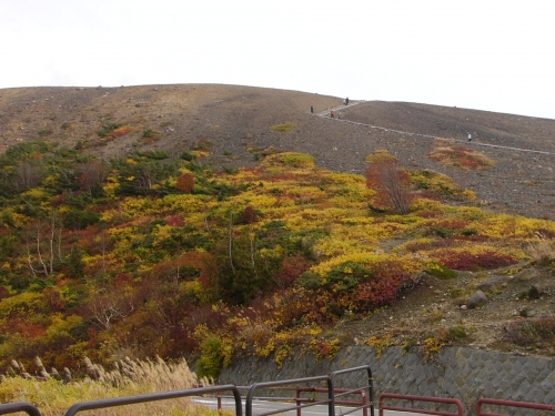 山頂には周囲1.5km、直径約450mの大きな噴火口が広がっています。また、山頂からは浄土平の風景が一望できる他、紅葉の季節には色づく高山の山の景色が楽しめます。