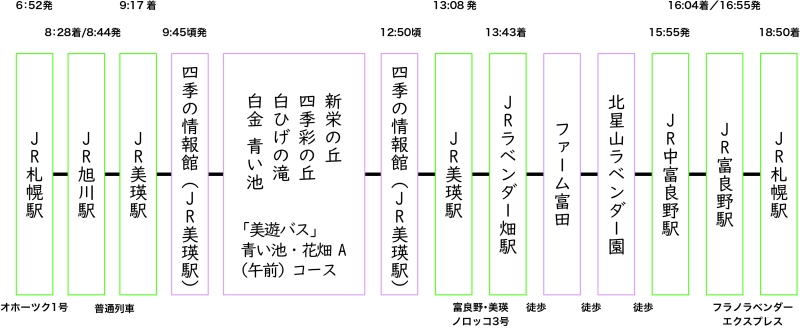 筆者が、1日でどのように美瑛と富良野を回ったのか表にしてみました。こちらは2024年7月の情報ですのでご参考までに。金額に関しては、この記事は2025年のものを表記しています。
