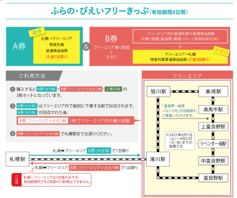 札幌駅からフリーエリアまでの往復特急列車自由席と、フリーエリア内の普通列車の普通車自由席の乗り放題がセットになったおトクなきっぷです。
