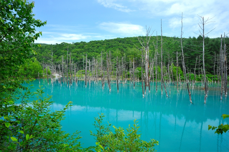 今や多くの人が一生に一度は見たい絶景にその名を挙げる美瑛町の「青い池」。もともとは十勝岳の火山泥流災害を防ぐために造られた堰堤で、そこに流れ込んだ美瑛川が堰き止められて現在の池のような姿になりました。水没したカラマツや白樺などの樹木は立ち枯れ、よりいっそう幻想的な雰囲気を作り上げています。