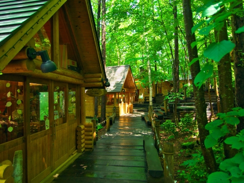 どの季節でも楽しめるスポットですが、冬はとくにロマンチック!雪景色のなか、暖かい色の灯りでライトアップされ、ログハウスが浮かび上がる光景は、どこか物語の世界のよう。