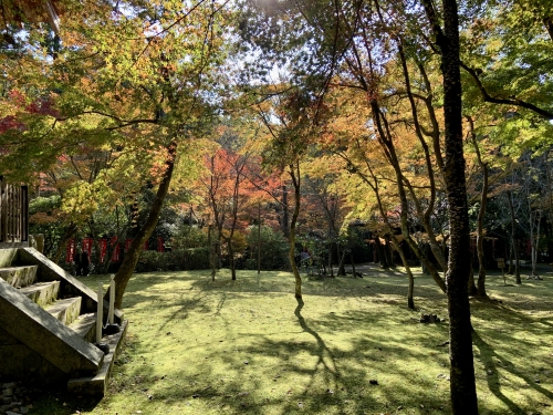 伽藍のエリアでも、紅葉が楽しめます。特に、仁王門から金堂へと続く道が美しいです。両側からモミジが張り出し、紅葉のトンネルが楽しめます。観光客が多いときはタイミングが難しいですが、紅葉の奥に仁王門が入るように写真を撮ってみても良いでしょう。