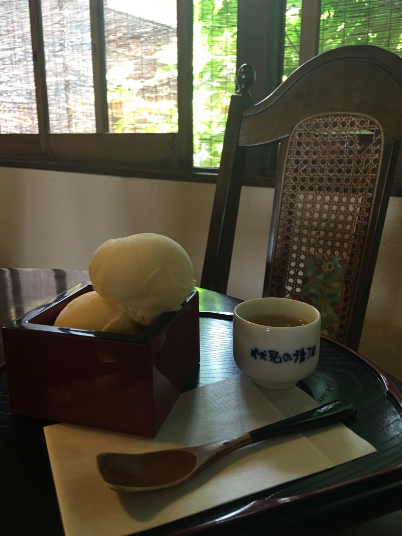 ここの名物アイスクリーム、清酒アイスクリーム!升に入ったバニラアイスクリームに月桂冠の清酒をかけて食べるという、ユニークなアイスクリームです。お酒とアイスクリームの意外な組み合わせですが、結構合いますよ。