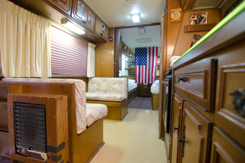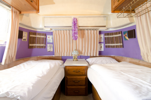 外観からも見てわかる通りキャラバン(ヴィンテージカー)だけでなく、寝台列車も屋内外に各1台ずつ大胆に設置してあります。中は寝台列車そのもので、屋内は2ベッド、屋外は4ベッドの部屋となっています。世界的にも本物の寝台列車は廃線の傾向にありますが、ここでならいつでもその雰囲気の疑似体験可能です。