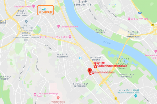 ベースキャンプ・ボンは、市内中心地からは少し離れますがアクセスは良好。最寄り駅は地下鉄Ollenhauserstraßeで、ボン中央駅から地下鉄(U-Bahn)で約15分ほどで到着します。