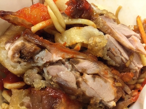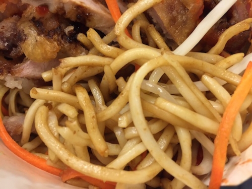 紙でできたヌードルボックスの中に、焼きそばと揚げた鶏肉が入っています。麺にはほんのりしょうゆ味がついています。なかなかボリュームがあるのでこれひとつでお腹いっぱいになります。