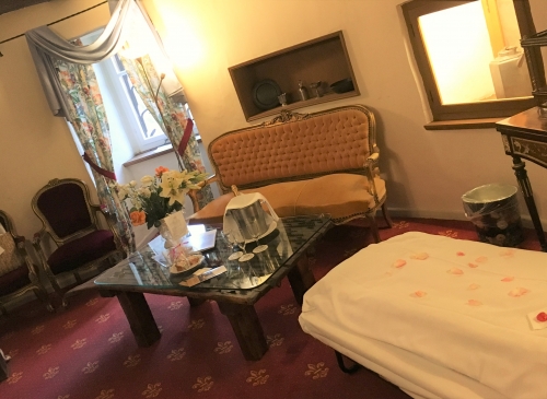 なんといっても見どころは、このベッドメイキング♡ハート型にととのえられ、生花の花びらがあしらわれており、このホテルのメルヘン度をさらにUPさせます♪気分はもうこのお城のお姫さま♡