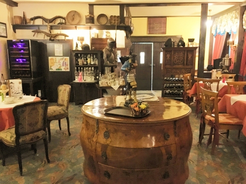 フロントの奥に続くレストランにも調度品が並べられており、無駄な光の無い空間はムード抜群。窓側の席からは、のどかな町の風景を望むこともできます。