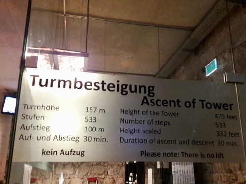受付にある案内には、塔の高さ157m、階段の数533段、塔の展望エリアの高さ100m、そして塔を登って降りるのに30分かかると記されています!
