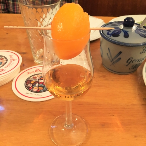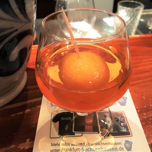ザクセンハウゼン地区のアップルワイン酒場では、食後にMispelchen(ミスペルヒェン)というお酒を飲むのが定番のようです。グループで食事しているテーブルには次々とこちらが運ばれていくのを目にします。