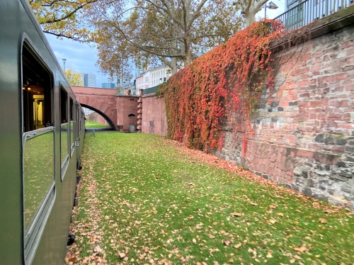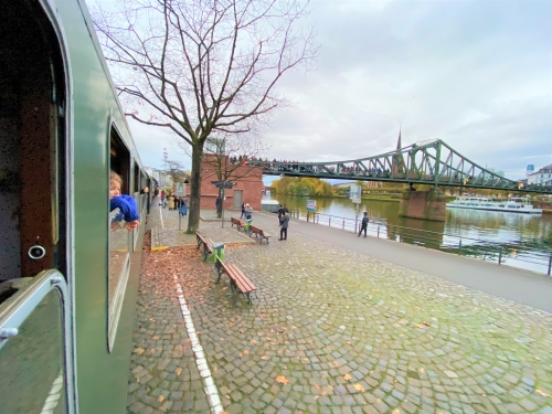 今回ご紹介するのは、Hafenbahn(マイン川沿いの運行)です。乗り場はフランクフルトの観光名所のひとつでもある、"鉄の橋/Eisener Steg"のすぐ近く。市内中心地から徒歩10分ほどです。停留所は、市街地から鉄の橋に向かって右手にあります。普段は列車が走る場所ではないエリアなので、歴史鉄道が発着する際は、たくさんの人が集まり、その姿を写真におさめています。