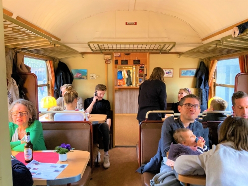 車内には小さな食堂車も連結しています。ここでは、ソーセージやスープなどの軽食から、スナック類やケーキの販売があります。もちろんビールやシャンパン、ジュースなどのお飲み物も販売されています。お土産品としてポストカードの販売もしており、筆者が乗車した際は、車内販売として翌年のカレンダーの販売も行われていました。