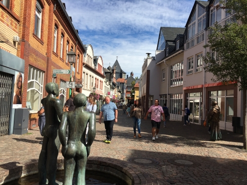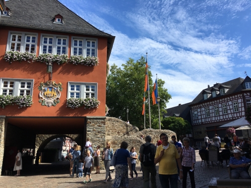 イトシュタインの見どころは旧市街に集まっており、駅から旧市街までは徒歩で約15分ほど。旧市街の入り口までたどり着くと、立ち並ぶお店や観光客で少しにぎやかさが増してきます。中心部である“ケーニヒ・アドルフ広場”に到着すれば、色鮮やかで、かつ歴史的な木組みの家が現れます。