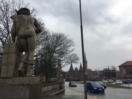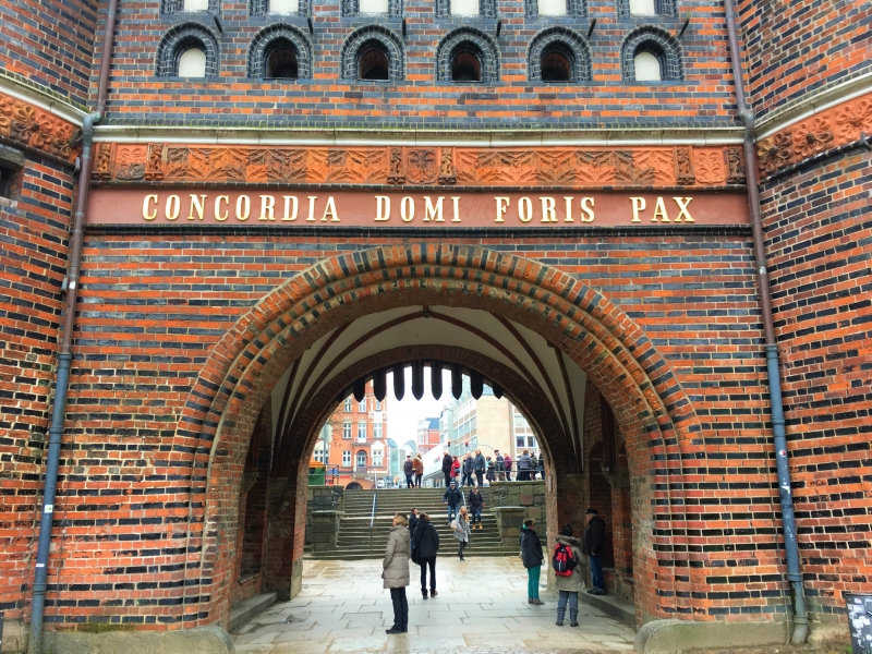駅を出て市街地へ向かい歩き、ほどなくしてすぐにこの町の入口であり、シンボルともいえるホルステン門がお出迎えです。赤レンガ造りで他に類を見ないその存在感ある門は、その先に広がるリューベックの町を守り隠すかのような印象を受けます。ちなみに、町への入口側の壁をより頑丈に建設したことから、少し傾いているのが見て取れます。