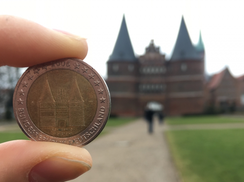 このホルステン門はリューベックのシンボルであることはもちろんですが、州を代表する歴史的建造物です。というのも、ドイツでは通常のユーロコインとは別に連邦州ごとのデザインもあり、リューベックのあるシュレースヴィヒ=ホルシュタイン州の2ユーロコインの柄は、このホルステン門が刻まれています。
