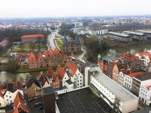 ホルステン門を正面から見た際に、背後にひときわ目立って立っている1本の塔が聖ペトリ教会です。教会自体はモダンなつくりとなっていますが、見どころは展望台。エスカレーターで展望階まで登れば、リューベックの街を180度眺望することできます。