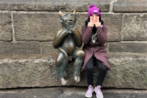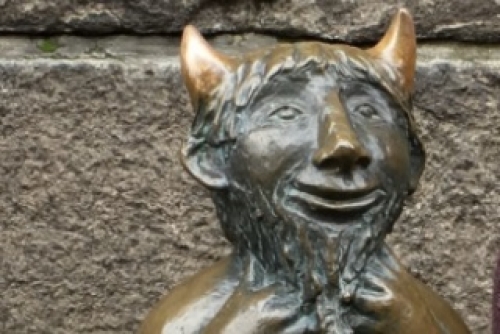 マリエン教会のすぐそばに、何かうれしそうな顔をしている銅像が座っています。この子は実は悪魔で、こんな物語があるのです。