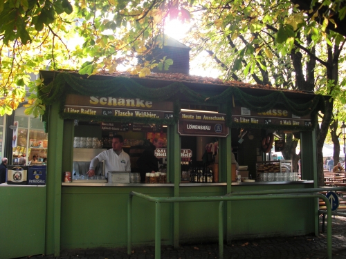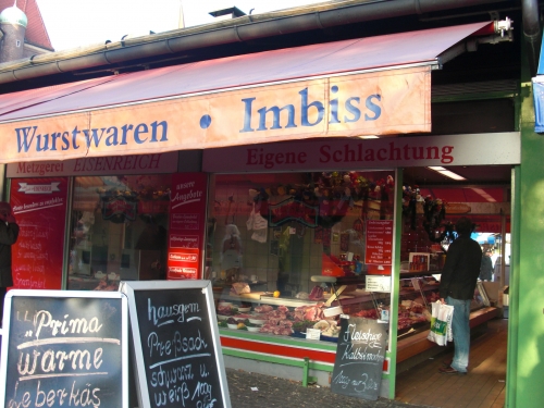 市場には「Imbiss(インビス)」というソーセージなどのお惣菜を出してくれる売店がいっぱいあるので、そこでおつまみがGETできます。ちなみにImbissは、駅や街角のあちこちでも見られますヨ。