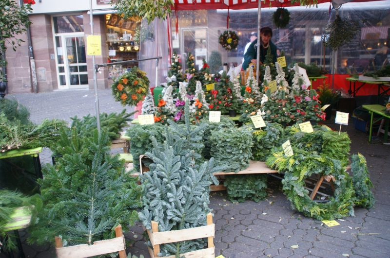 クリスマスマルクトに限らず、この時季には通常の市場や町のお花屋さんにも、リースやアドヴェンツクランツがずらりと並びます。ことさらに鮮やかな色彩は、長く続くドイツの冬を乗り切るための“知恵”なのかもしれません。