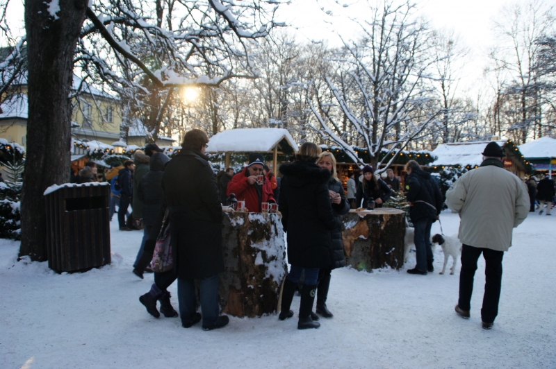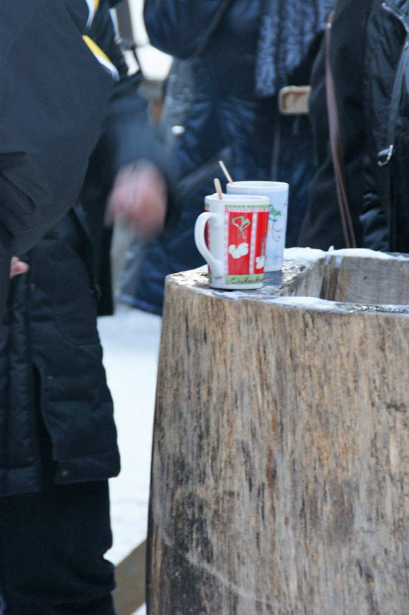 クリスマスマルクトには欠かせない飲み物といえば、グリューワイン(ホットワインにハーブやスパイスを加えたもの)。こちらのマルクトでは、木の切り株をテーブルにして、グリューワインや温かい食べ物をいただくことができます。