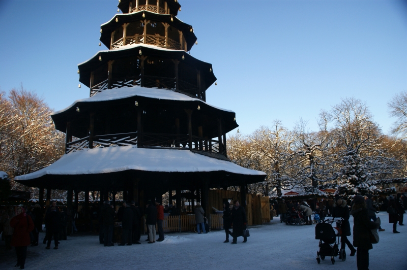 ミュンヘン市民の憩いの場所、英国公園(イングリッシャーガーデン/Englische Garten)の中に建つ【中国の塔(Chinesischer Turm)】。夏には塔の周りでビアガーデンが開かれていますが、冬は一転、華やかなクリスマスマルクトへと様変わりします。