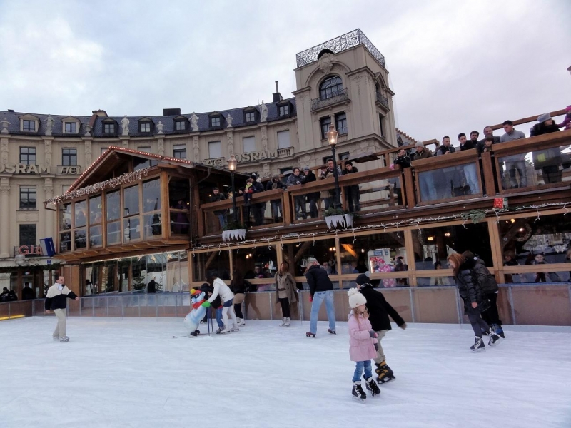 ミュンヘン市内の繁華街の中でもとりわけ賑わっているのが、中央駅からもほど近い「カールス広場(Karlsplatz)」。ふだんは噴水が設置された広場に、冬季限定で登場するのが屋外アイススケート場【Münchner Eiszauber】なのです。